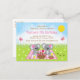 Este convite de aniversário fofo e caprichoso apresenta ursos adoráveis fazendo um piquenique em uma toalha xadrez rosa com guloseimas como mel, melancia, geleia de morango, limonada e torta. Ao fundo, um céu azul brilhante e sol, borboletas e margaridas. O texto combina fontes decorativas e serifadas para um visual elegante e moderno. Isso é perfeito para uma festa de aniversário de primavera ou verão.