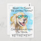 Cartão de parabéns de aposentadoria fofo e moderno com um golden retriever engraçado em uma praia tropical. Design original criado a partir de uma de nossas aquarelas pintadas à mão.