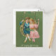Este cartão postal apresenta uma imagem antiga de domínio público da década de 1920 de um casal compartilhando um balanço em forma de ferradura da sorte com a mensagem "Feliz Aniversário" na parte inferior.