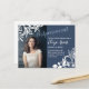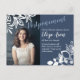 Alterações inesperadas de data podem ocorrer. Envie aos seus convidados um cartão postal de adiamento de data com cinzas azuis e tema de cor floral branca. Estes cartões de anúncio de adiamento são perfeitos para qualquer Bat Mitzvah, graduação, Quinceanera, aniversário de adolescentes, aniversário, formatura ou celebração de casamento.