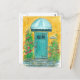 Um cartão de posto bonito, decorado com uma pintura aquosa de uma porta azul turquesa brilhante e uma casota amarela mostarda com hollyhocks vermelhos. Belo cartão postal por usar como "nós mudamos o anúncio para deixar amigos, família e clientes saberem sua nova localização.