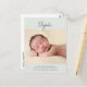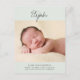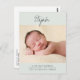 Este simples cartão postal de anúncio de nascimento de cinza verde e carvão apresenta um design mínimo e uma foto grande. O nome do seu bebê está escrito acima da foto em um roteiro manuscrito. Abaixo da foto, você pode adicionar o nome do seu cheio, a data de nascimento, estatísticas de nascimento e seus nomes. Na parte de trás do cartão postal, você encontrará espaço para escrever uma mensagem personalizada mais longa para os entes queridos.
