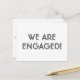 Cartaz de anúncio simples e minimalista do noivado com o texto "estamos engajados" com uma tipografia de tendência mínima em preto e branco. Personalize as costas com qualquer texto. Ideal para compartilhar as grandes notícias com sua família e amigos se você vive longe. Você pode alterar a fonte, as cores e a posição do texto clicando no botão para editar a design.