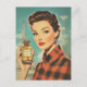 Um glamouroso pôster vintage dos anos 1950 apresentando uma mulher sofisticada de xadrez vermelho segurando uma garrafa de perfume luxuosa rotulada “PERFUME”. A Torre Eiffel se ergue ao fundo, realçando o estilo parisiense chique com cores ousadas, moda retrô e beleza clássica.