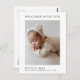 Este design moderno e simples apresenta um fundo branco minimalista e uma caligrafia preta. O cabeçalho "bem-vindo com amor" e outro texto personalizado: mensagem, nome do bebê e estatísticas, estão em tipografia clássica, elegante. Há uma foto de solteiro no centro. O reverso contém uma mensagem de obrigado personalizada. Crie seu próprio cartões de agradecimentos de chá de fraldas/novo anúncio de nascimento do bebê clicando no botão "Personalizar" e substituindo os modelos por seus detalhes e fotografia.