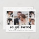 Este cartão postal de anúncio de casamento simples, preto e branco apresenta uma tipografia moderna, casual, que diz "casámo-nos", com uma multigrelha fotográfica de cinco fotografias. Uma forma na moda para que amigos e familiares saibam sobre seu elopeio, microcasamento ou casamento pequeno.