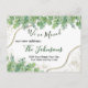Adicione o seu cartão-postal com uma aparência elegante usando este estilo design de folhagem botânica eucalipto com elementos visuais de folha de ouro e fontes artísticas. Esta aquarela deixa a arte para amantes de plantas, assim como com o toque de lindas ondas de ouro e características de aspersão. Você pode personalizar isso substituindo os textos por suas próprias informações e preferidas.
