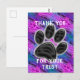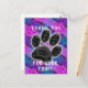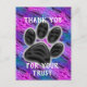 Se você é um consultório veterinário, um pet shop ou um passeador de cães, promova seu negócio com um cartão-postal barato. Este cartão-postal de apreciação ao cliente apresenta uma grande pegada preta em um fundo listrado diagonal de azul e roxo. "Obrigado por Sua Confiança" pode ser personalizado rápida e facilmente se desejar.