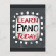 "Aprenda Piano Hoje" é um design de texto fofo em cinza com texto preto e vermelho. Ele está em uma forma de destaque branca e pontinhos brancos ao redor.
