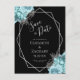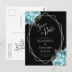 Este elegante cartão-postal moderno de save-the-date de casamento apresenta uma moldura geométrica prateada decorada com flores aqua e prateadas em um fundo preto. O texto personalizável combina escrita à mão caprichosa cinza prateada, fontes copperplate e itálicas. Adicione seu endereço de retorno e outras informações no verso.
