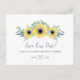 Anuncie seu noivado com o meu cartão de "save the date" em aquarela botânica de girassol, folhagens de eucalipto e azul com a frase "save our date" em caligrafia sofisticada. O cartão floral tem o verso numa cor azul sólida complementar com seus nomes e data de casamento com espaço fornecido para o endereço do convidado. Anúncio de casamento perfeito para casamentos de jardim no final do verão e outono. Para ver o conjunto de papelaria de casamento correspondente visite VG Invites no Zazzle