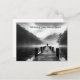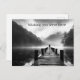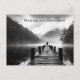 Foto preta e branca olhando para uma doca antiga em um lago aninhado em uma cordilheira. Um homem solitário caminha até o fim do cais enquanto o nevoeiro matinal se derrete lentamente. Feito com algoritmos generativos e Photoshop.