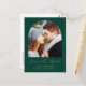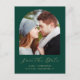 Este simples e minimalista cartão postal Save the Date apresenta uma fotografia em forma de arco acima das palavras "Save the Date" em elegante guião de escrita manual dourada, seguida pelos nomes dos casais, data do casamento e cidade em sans serif num fundo verde esmeralda. Adicione o seu endereço de retorno juntamente com detalhes adicionais na parte traseira.