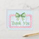 Este lindo cartão de agradecimento apresenta uma moldura rosa com listras azuis e brancas e encimado por um laço xadrez de gingham verde e branco. Personalize com a sua escolha de texto especial.