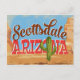 Arte de poster neoviagens vintage de Scottsdale Arizona em desenho retro com deserto, cacto e rocha vermelha.