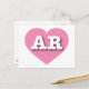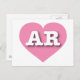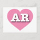 Este cartão-postal apresenta um legal coração cor-de-rosa contendo as letras maiúsculas, brancas e em negrito AR, a abreviatura oficial de Arkansas, o estado natural. O reverso da placa é vazio, aguardando seus sentimentos manuscritos ou texto personalizado.