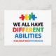 Este poderoso design de conscientização destaca a inclusão e a neurodiversidade por meio de tipografia em negrito e elementos de quebra-cabeça coloridos. A frase “Nós Todos Temos Habilidades Diferentes” é apresentada com letras vibrantes para enfatizar a singularidade, aceitação e respeito por todas as mentes. Um layout limpo e moderno transmite uma mensagem positiva e edificante que ressoa com a conscientização sobre autismo, educação e comunidades inclusivas. Projetado para se destacar enquanto divulga empatia e compreensão.