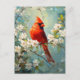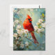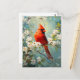 Um belo cartão postal com um cardeal vibrante encravado em meio a delicadas flores brancas florescentes, capturando a harmonia pacífica da natureza em um design artístico impressionante.