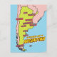 Este mapa ilustrado da Argentina é feito em um vibrante estilo de arte pop. O mapa é delineado em preto e preenchido com uma cor amarela brilhante, colocado contra um fundo azul com um padrão pontilhado. As principais cidades da Argentina são identificadas em caixas azuis.
