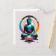 Uma estátua de Buda está sentada em meio a um colorido círculo Zen, com uma flor de lótus.