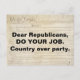 Caros Republicanos, FAÇAM SEU TRABALHO. Festa sobre o campo. Texto negro sobre um pano de fundo do artigo I e do preâmbulo "Nós, as Pessoas" da Constituição. Escreva ao Congresso. Diga-lhes para fazerem o seu trabalho.