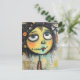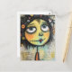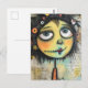 Um personagem caprichoso com olhos grandes exagerados e uma boca costurada é o ponto focal contra um fundo cheio de textos e abstrato. O cabelo da personagem é adornado com várias formas e objetos coloridos, adicionando uma vibração lúdica e excêntrica à peça.