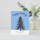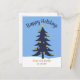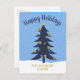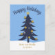 Um desenho animado azul escura e esverdeado, com uma estrela dourada e ornamentos circulares de bola brilhantes simulados. A árvore é cercada por um céu azul brilhante e flocos de neve brancos caindo. A árvore está em um banco de neve branco. Feriados felizes em fontes azuis e uma segunda linha em fontes amarelas/castanhas ouros escuras podem ser personalizados com sua própria mensagem.