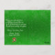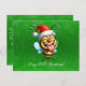 Uma linda abelha feliz segurando presentes nas asas, em um fundo verde de floco de neve. Texto "Happ-BEE Christmas!" em frente com a mensagem de Natal no verso, que também é um fundo verde em floco de neve.