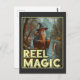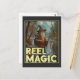 Esta imagem balnear apresenta um feiticeiro parado por um rio numa área florestal, segurando uma vara de pesca com um peixe flutuando em direção à linha. Vestido em trajes de bruxo tradicionais, incluindo um roupão longo e um chapéu pontiagudo, o bruxo lança um feitiço mágico durante a pesca. O fundo, com árvores e montanhas, cria uma atmosfera mística e serena. O texto "REEL MAGIC" exibido com destaque na parte inferior da imagem, adiciona um toque humorístico e mágico à cena.