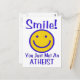 Coloque um rosto humano no ateísmo com um rosto amarelo brilhante esboçado em azul com letras azuis que diz: "Sorria! Acabou de conhecer um ATEISTA."