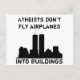 Imagem das torres gêmeas do centro de comércio mundial antes do ataque em 11 de setembro (911 nove onze 9 11) com a legenda "ateus não pilotam aviões em construções. No dia 11 de setembro, o centro de comércio mundial foi destruído sem escrúpulos. Não por um governo ou cientista louco ou mesmo alguém com motivações financeiras. Foi destruída por um grupo religioso fundamentalista. Nove Onze foi uma iniciativa baseada na fé. Muçulmanos islâmicos fundamentalistas assassinaram milhares de cidadãos americanos a sangue frio em nome de Deus. Engraçado que os ateus sejam a minoria menos confiável. Especialmente quando se considera que os ateus não levam aviões a construções.
