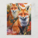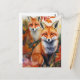 Este cartão postal sazonal apresenta a aquarela de duas raposas em uma floresta no outono. As casacos das criaturas da floresta são complementadas pelas cores quentes de queda em um esquema de cor de laranja e vermelhos profundos.