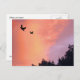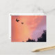 Este belo cartão postal de fotografia de arte captura duas pombas voando para o pôr do sol. O céu parece estar em chamas com nuvens em cores arco-íris de vermelho, laranja, amarelo, azul, magenta e roxo. Apenas os topos das árvores estão mostrando na silhueta preta.