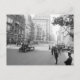 No início dos anos 1900, foto da Parada de 4 de julho com um antigo avião sendo puxado em uma cama plana, carros antigos, polícia e multidões. Provavelmente Nova Iorque.