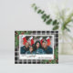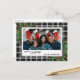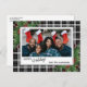 Cartão de Natal único, clássico, moderno, bonito e decorativo. Texto de Boas Festas alegre e espaço para personalizar ou personalizar com uma foto, nome da família (ou nomes individuais) e mensagem de sua escolha. Enquadrado por bagas de vinho tinto burgundy e buquês de folhagem verde em um fundo xadrez preto e branco de casa de campo francesa.