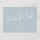Adiamento de casamento personalizado/alteração do cartão postal com design de inscrição manual branca moderna sobre fundo azul empoeirado.