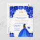 Este convite de aniversário de sweet sixteen elegante e glamoroso apresenta uma bela princesa de pele escura em um vestido de baile azul real. O texto combina caligrafia manuscrita e fontes modernas sem serifa para um visual sofisticado e elegante. Os arranjos florais, borboleta e confetes dourados criam a combinação perfeita de rústico e chique.
