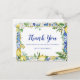 Um lindo cartão de agradecimento que apresenta uma borda de azulejo mosaico azul com uma moldura fina dourada no centro. Limões, flores brancas e folhas verdes de sálvia estão entrelaçados para criar um ambiente botânico moderno. Obrigado está escrito em uma caligrafia moderna bonita. Seu nome está abaixo em um texto elegante.