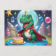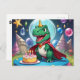 Cartão Postal Babay T-Rex com capa em frente ao bolo de aniversá