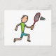 O jogador de Badminton salta e joga o obturador de volta para o outro lado do tribunal. Gráfico desportivo de emblema divertido com jogador, raquete e vaivém, tudo em ação desenhada à mão no cheio.