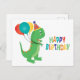 Ilustração fofa de um dinossauro segurando três balões e usando um chapéu de festa de aniversário!