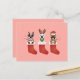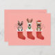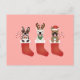 Ilustração de três Bulldog Franceses numa estocagem de Natal. Todos os três cães estão vestindo roupas únicas de Natal para o Natal.