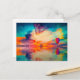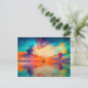 Uma imagem cênica colorida de um balão de ar quente voando no pôr do sol sobre a água.