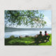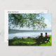 Como este casal parece tranquilo sentado em um banco sombreado em um dia quente de verão, admirando o belo Lago Cayuga e desfrutando da brisa suave. Um galho de salgueiro pendente fornece sombra salpicada. A grama é de uma linda tonalidade verde e há algumas nuvens no céu azul. Este cartão-postal transmite a serenidade do dia.