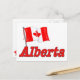 Grandes letras vermelhas explicam o nome da província de Alberta, com uma bandeira canadense ondulada voando atrás dela. Esse design está disponível em uma grande variedade de t-shirts, presentes e outras roupa.