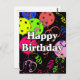 Cartão de aniversário festivo para um jogador de pickleball com confetes coloridos e balões de pickleball em um fundo preto. Balões azuis, vermelhos, verdes brilhantes, amarelos, rosa quente e lavanda feitos a partir de bolas de pickleball. O verso diz - Parabéns por mais um ano dominando a linha da cozinha! Espero que seu aniversário seja um sucesso! Seu Parceiro de Dinks. Personalize como desejar para seu pickleball favorito. Cartão postal de aniversário colorido com tema de pickleball para sua mãe, pai, tio, tia, irmão, irmã, vizinho, avô, avó, marido, esposa, amigo ou colega de trabalho que não para de falar sobre pickleball.
