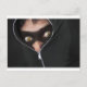 Uma foto de um ladrão com olhos amarelos vestindo uma máscara e um capuz perfurado até o nariz.