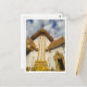 This Bangkok postcard features a majestic image of Wat Traimit, also known as The Temple of the Golden Buddha, captured from a dramatic low-angle perspective. The striking architecture is richly adorned with gold accents, contrasting beautifully with the clean white exterior and the vivid blue sky dotted with fluffy clouds. The ornate gables and the intricate golden doorway highlight the elegance and spiritual grandeur of Thai temple design.