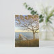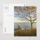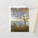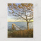 Personalize este cartão postal! Um píer privado e uma árvore do outono tardio são banhados à luz do ouro, contra um céu azul claro. No horizonte, as cores do pôr do sol iluminam as pequenas ilhas no horizonte distante. Fotografia de Minerva Bloom.
