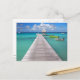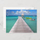 Cartão postal de vários barcos num cais na lagoa turquesa clara de uma ilha tropical na Polinésia Francesa no oceano Pacífico.